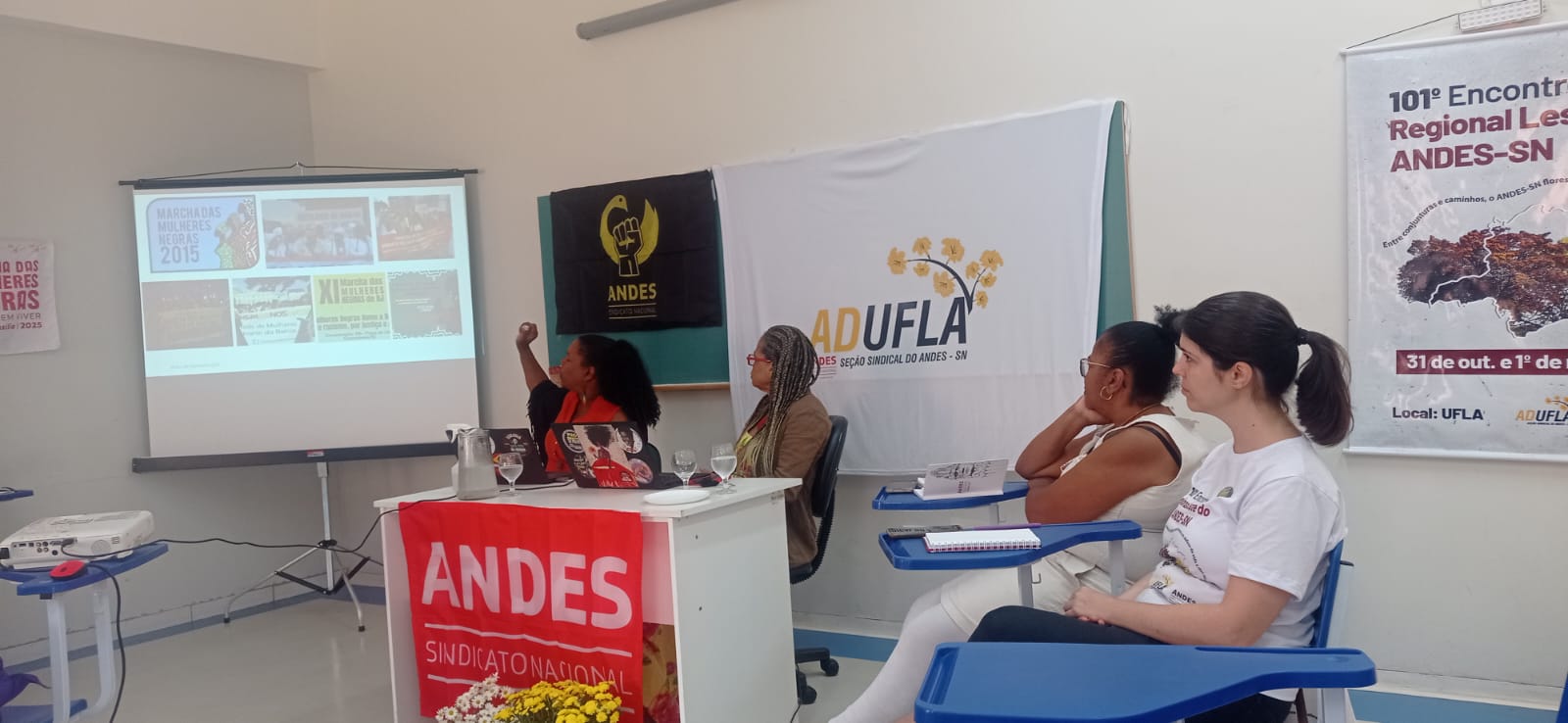 Durante a manhã, o presidente da ADUFSJ acompanhou a mesa “Das ruas à universidade — a potência da Marcha das mulheres negras”, mediada pela professora Jacyara Silva de Paiva da Universidade Federal do Espírito Santo (UFES), com participação de Ana Lúcia da Silva e Adriana Silva, do Fórum Nacional de Mulheres Negras.